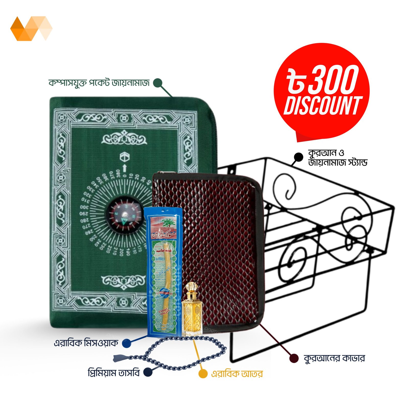 এই ইসলামিক স্পেশাল নামাজ কম্বো সেটটি আপনার ইবাদতের সময়কে করবে আরও পরিপূর্ণ ও সুন্দর। সেটটিতে রয়েছে কম্পাসযুক্ত প্রিন্টেড জায়নামাজ, যার সাহায্যে সহজেই সঠিক কিবলার দিক নির্ণয় করা যায়। সঙ্গে রয়েছে টেকসই মেটাল স্ট্যান্ড, যেখানে কুরআন শরীফ ও জায়নামাজ সহজে রাখা যায়। কুরআনের জন্য একটি মার্জিত ও সুরক্ষিত কাভার দেওয়া আছে, যা কুরআন শরীফকে রাখবে ধুলোবালি ও ক্ষতি থেকে নিরাপদে। এতে আরও রয়েছে এরাবিক মিসওয়াক, যা সুন্নত অনুযায়ী মুখের পরিচ্ছন্নতা বজায় রাখতে সাহায্য করে, এবং একটি প্রিমিয়াম তাসবিহ, যা জিকিরে এনে দেবে এক বিশেষ প্রশান্তি। সবশেষে রয়েছে মনমুগ্ধকর এরাবিক আতর, যা নামাজের আগে ব্যবহার করলে ছড়িয়ে পড়ে পবিত্র সুবাস। এই সম্পূর্ণ সেটটির সঙ্গে পাচ্ছেন ৩০০ টাকার বিশেষ ছাড়, যা একে করে তুলেছে নিজের জন্য বা প্রিয়জনকে উপহার দেওয়ার জন্য এক অনন্য বরকতময় পছন্দ।